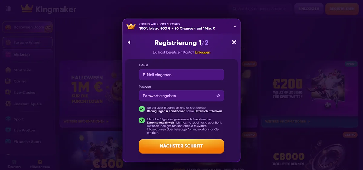 Die Kingmaker Casino Registrierung erfolgt über ein standardisiertes Online-Formular. Spieler müssen grundlegende persönliche Daten wie Name, E-Mail-Adresse und Geburtsdatum angeben.