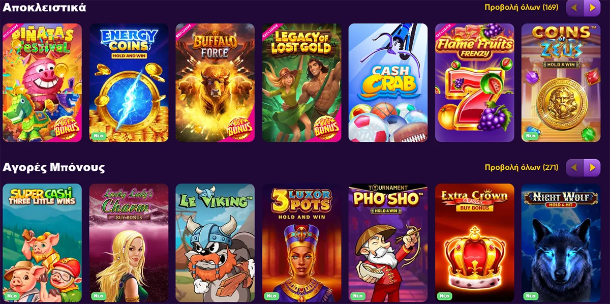 Η πλατφόρμα μας φιλοξενεί ένα ευρύ φάσμα κουλοχέρηδων από τους παρόχους Pragmatic Play, NetEnt, Playtech και Microgaming. Διαθέτουμε κλασικά φρουτάκια με παραδοσιακά σύμβολα και σύγχρονα video slots με megaways μηχανικές.
