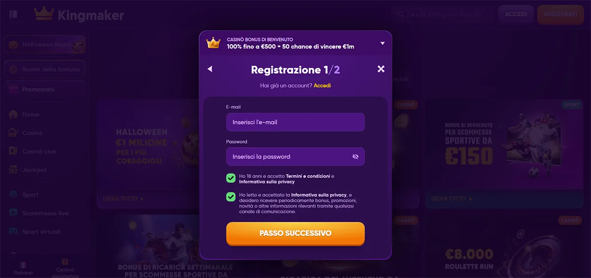 La registrazione rapida richiede meno di cinque minuti. Durante l'iscrizione casinò, i giocatori devono accettare i termini e condizioni completi.